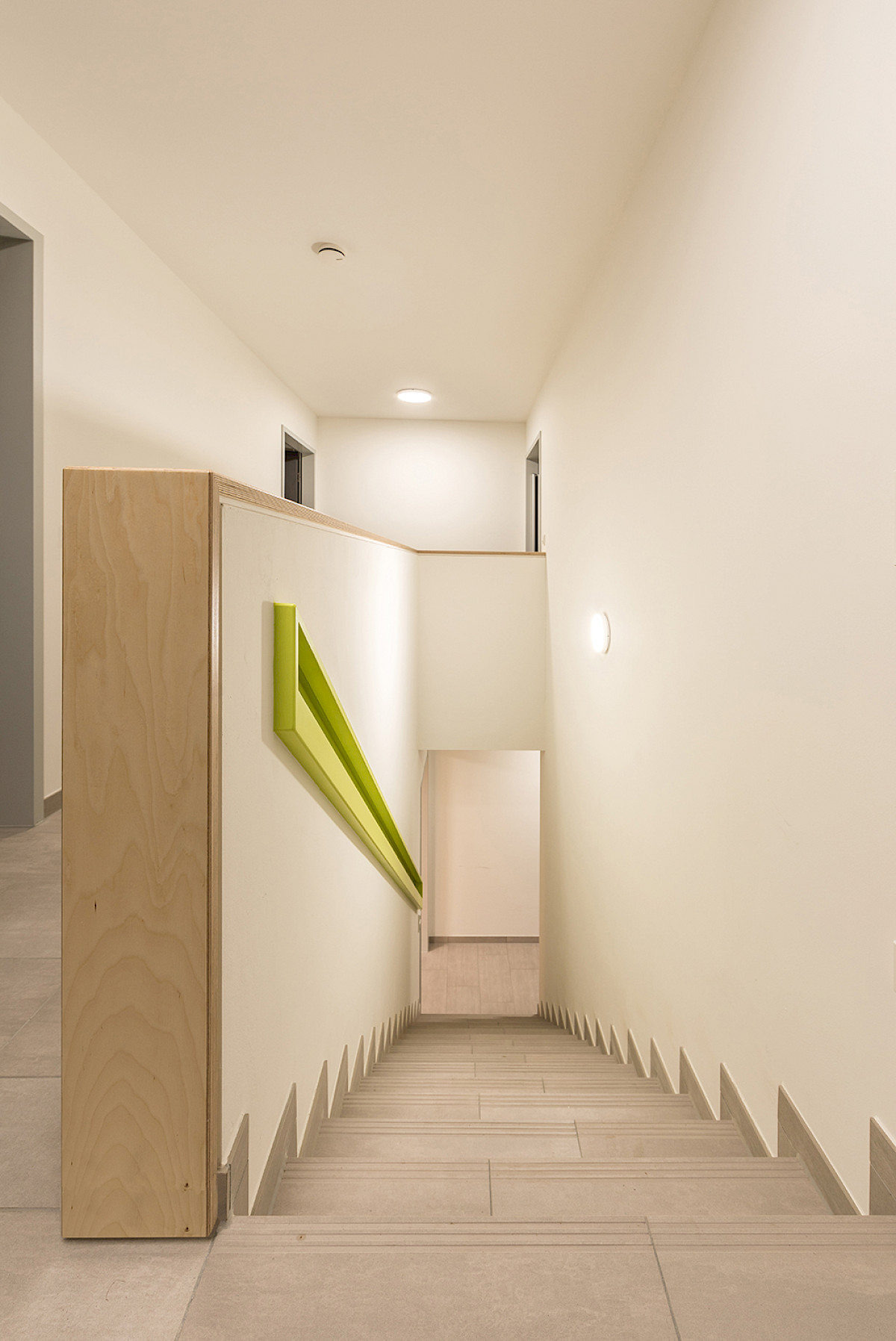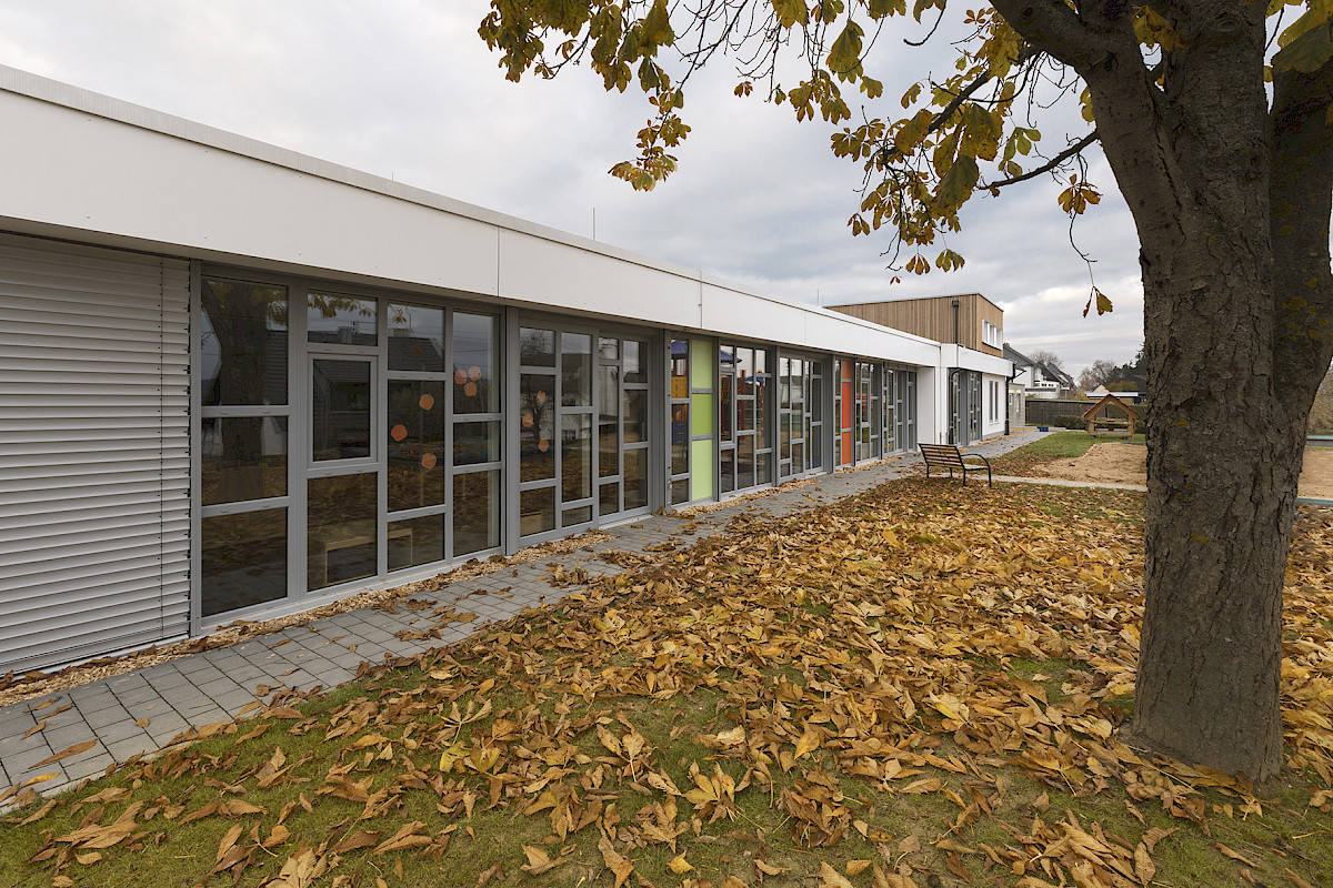 Da der Kindergarten in der damaligen Größe dem Bedarf an Betreuungsplätzen nicht mehr gerecht werden konnte wurde außer den Sanierungsmaßnahmen ein neuer Gebäudeteil angebaut, in dem Gruppen-, Verwaltungs und Mehrzweckräume untergebracht sind. Der zweigeschossige Anbau setzt sich in seiner kubischen Form und Fassadengestaltung von dem Bestandsgebäude ab.