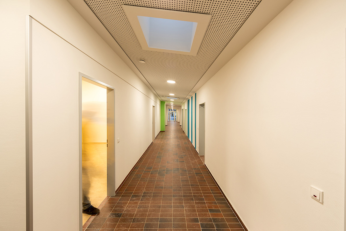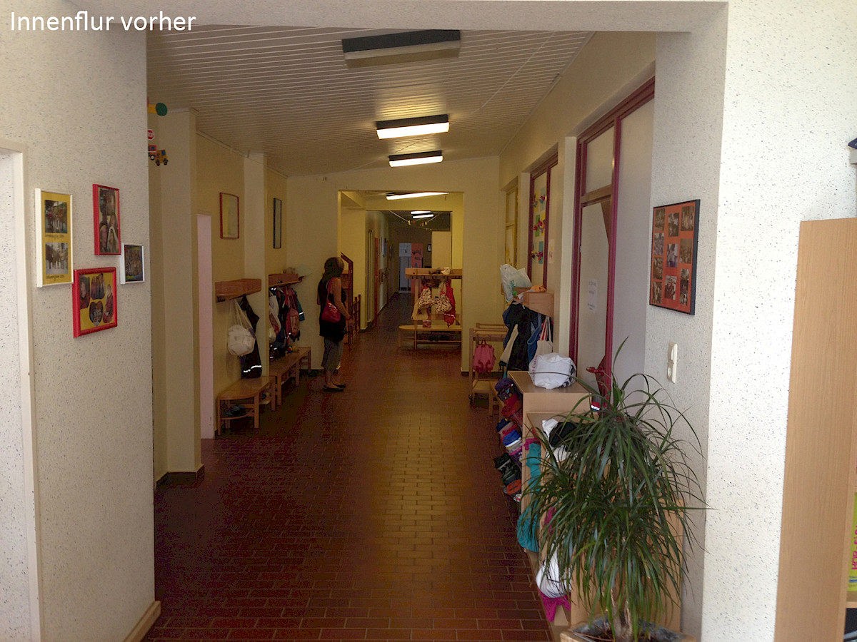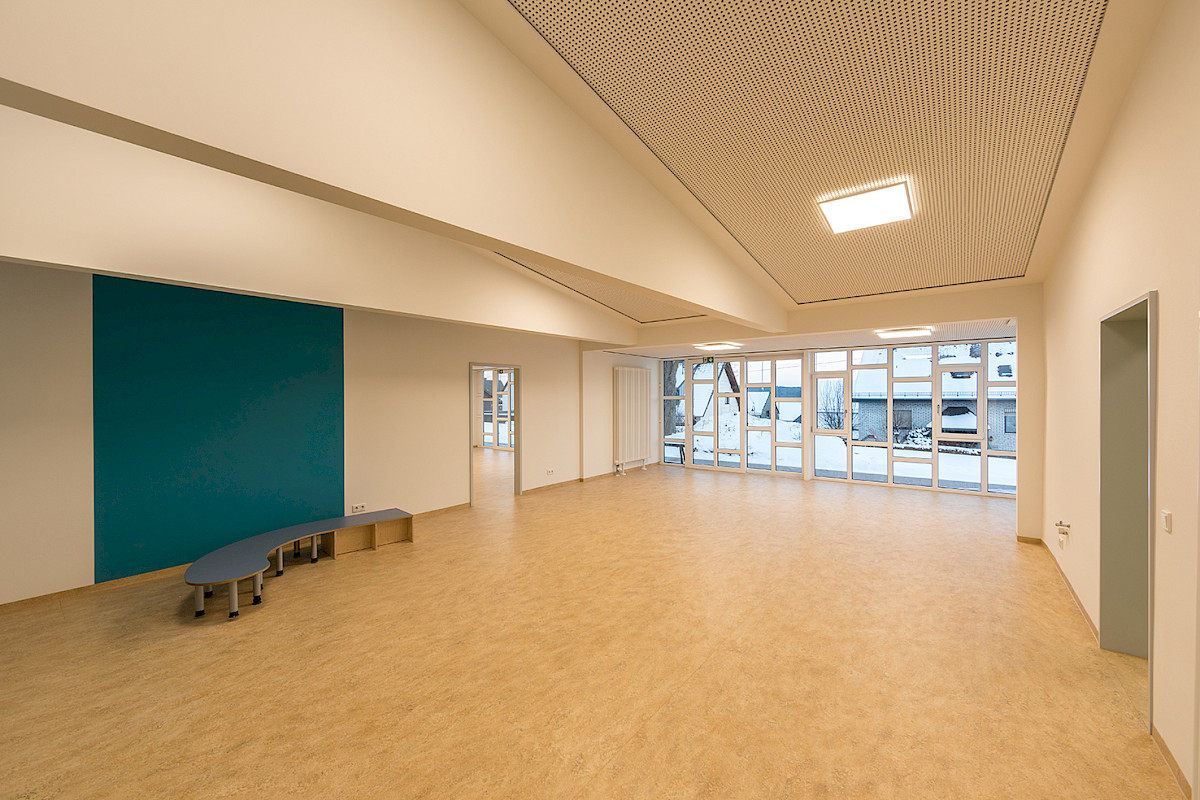 Im Rahmen der Sanierung des in die Jahre gekommenen Kindergartens der hunrücker Gemeinde wurden zahlreiche Maßnahmen geplant und umgesetzt. Es galt die interne Organisation des Gebäudes an aktuelle Belange anzupassen und das Gebäude hinsichtlich energetischer Maßnahmen an Dach und Aussenwand zu optimieren. Die bestehenden Gruppenräume wurden durch einen Anbau verlängert und so in deren Fläche an die Gruppengrößen angepasst. Neben der Erneuerung aller Bodenflächen und Wandbeschichtungen wurde das Dach von grundauf saniert und die Sanitär- und Küchenräume überplant und erneuert.