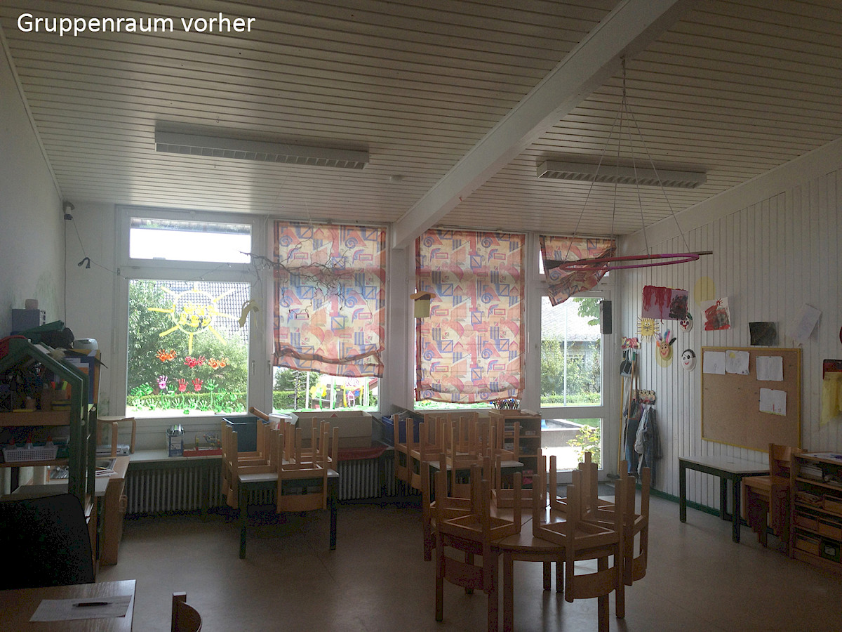 Im Rahmen der Sanierung des in die Jahre gekommenen Kindergartens der hunrücker Gemeinde wurden zahlreiche Maßnahmen geplant und umgesetzt. Es galt die interne Organisation des Gebäudes an aktuelle Belange anzupassen und das Gebäude hinsichtlich energetischer Maßnahmen an Dach und Aussenwand zu optimieren. Die bestehenden Gruppenräume wurden durch einen Anbau verlängert und so in deren Fläche an die Gruppengrößen angepasst. Neben der Erneuerung aller Bodenflächen und Wandbeschichtungen wurde das Dach von grundauf saniert und die Sanitär- und Küchenräume überplant und erneuert.